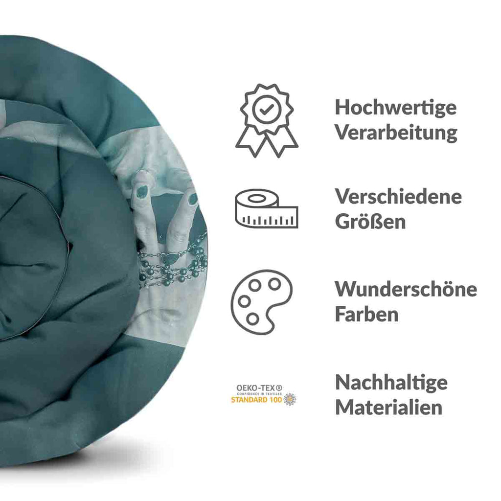 Das Petrol ist sehr intensiv und schön verarbeitet. Die Schlaufen zur Befestigung der Gewichtsdecke sind zahlreich und passen gut. Alles sehr zufriedenstellend.